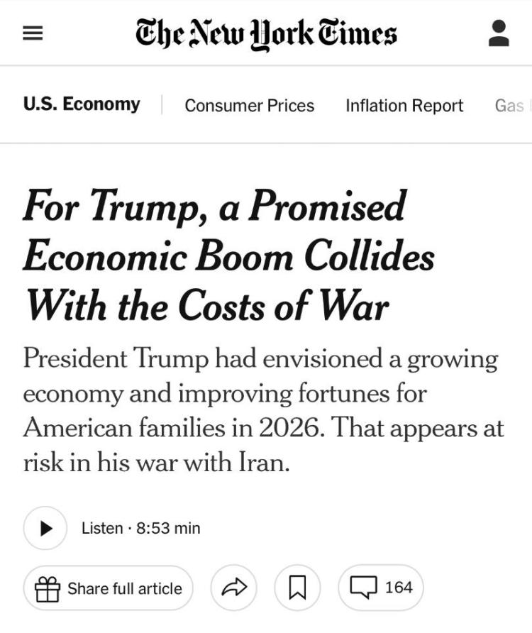 文章说,新年伊始,美国经济似乎正朝着美国政府期望的方向发展:股市表现强劲,物价开始趋于稳定。但这一切都发生在对伊朗发动战争前。如今,特朗普政府亲手颠覆了自己对国家经济轨迹的愿景,在中期选举前几个月制造了一系列新的风险。